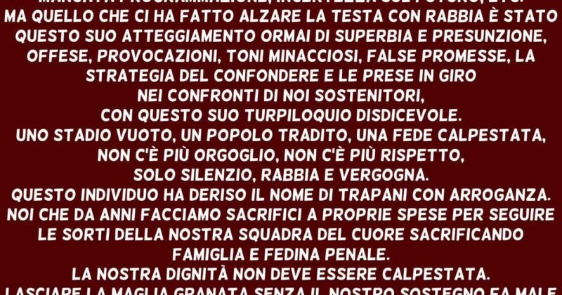 Corte Federale d’Appello respinge reclamo del Trapani Calcio, confermati i 7 punti di penalizzazione