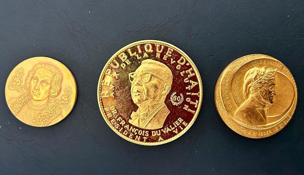 Le tre monete d’oro presentano soggetti storici. La prima reca l’effige di Cristoforo Colombo e sul retro la scritta Banca d’Italia 1893/1993, mentre le altre due recano rispettivamente l’effige del presidente della Repubblica di Haiti, François Duvalier, con sul retro la scritta 1000 Gourdes 1967, e l’effige di Dante Alighieri, con sul retro la scritta Banca d’Italia 1893/1993. Sono state sequestrate a settembre del 2013 dall’Ufficio di polizia di frontiera aerea dell’aeroporto “Falcone Borsellino” di Palermo a un ricettatore in procinto di partire per Parigi e consegnati all’Ufficio corpi di reato del Tribunale di Palermo. A rendere possibile l’assegnazione, un provvedimento del Ministero della Giustizia che prevede la destinazione a musei e istituti di tutela di beni sequestrati o confiscati nell’ambito di procedimenti penali, quando questi abbiano un valore storico, artistico, archeologico o scientifico.