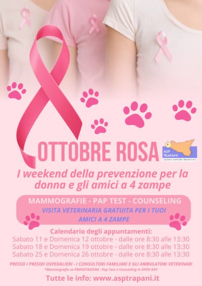 “Questa iniziativa rappresenta un’occasione per un approccio globale al benessere della persona. Da un lato, la prevenzione oncologica – attraverso pap-test e mammografia – tutela la salute del corpo; dall’altro, dedicare anche solo dieci minuti ai nostri amici a quattrozampe significa prendersi cura dell’anima, di chi ogni giorno ci regala affetto e amore incondizionato. È un modo per unire due dimensioni della vita che camminano insieme: la salute delle donne e il legame speciale con i loro animali” – dichiara Sabrina Pulvirenti, Commissario Straordinario dell’ASP Trapani. Per tutto il mese di ottobre l’ASP Trapani, inoltre, celebrerà l’Ottobre Rosa illuminando le proprie sedi principali di rosa, come simbolo di impegno e sensibilizzazione collettiva verso la prevenzione.