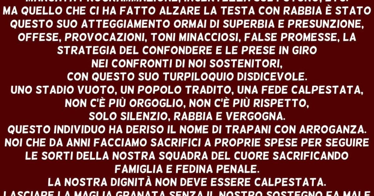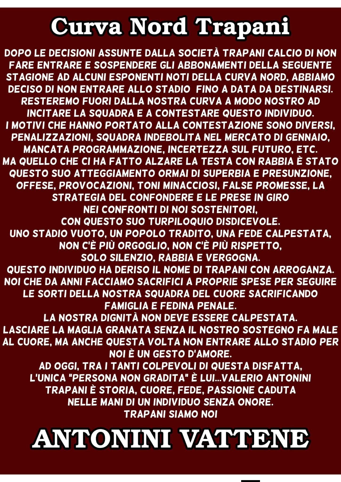 Trapani – In queste ore la Curva Nord granata – ha diffuso una nota durissima contro il patron del Trapani Calcio Valerio Antonini. La Curva Nord granata di fatto ha deciso di  non entrare allo stadio fino a data da destinarsi, e questo in segno di protesta nei confronti del patron della società granata.