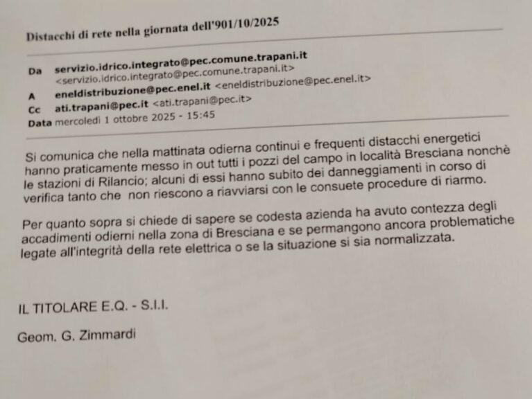 Trapani – Saranno addebitati all’Enel i danni dopo l’ennesimo fermo ai pozzi di Bresciana. La situazione dovrebbe normalizzarsi entro domenica. Il titolare di E.Q. Servizio Idrico Integrato del comune di Trapani, il geometra Zimmardi ha già scritto all’Enel.