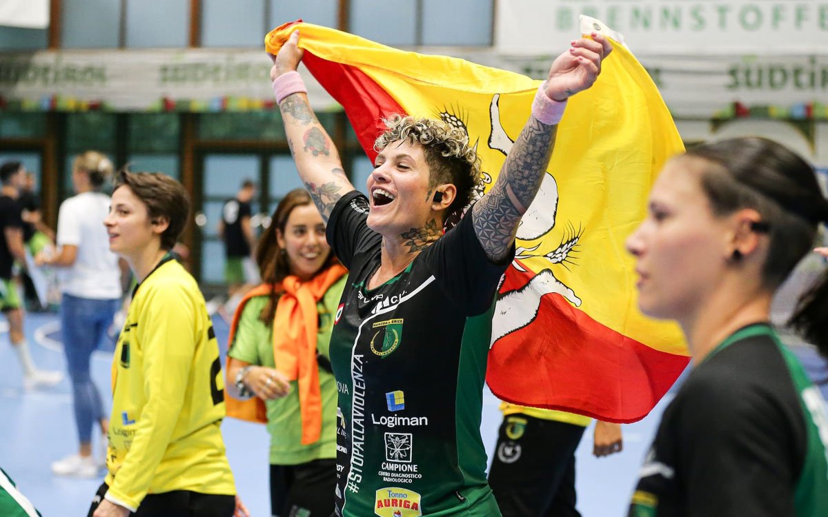 Giocatrice di pallamano dell’Handball Erice festeggia con la bandiera siciliana