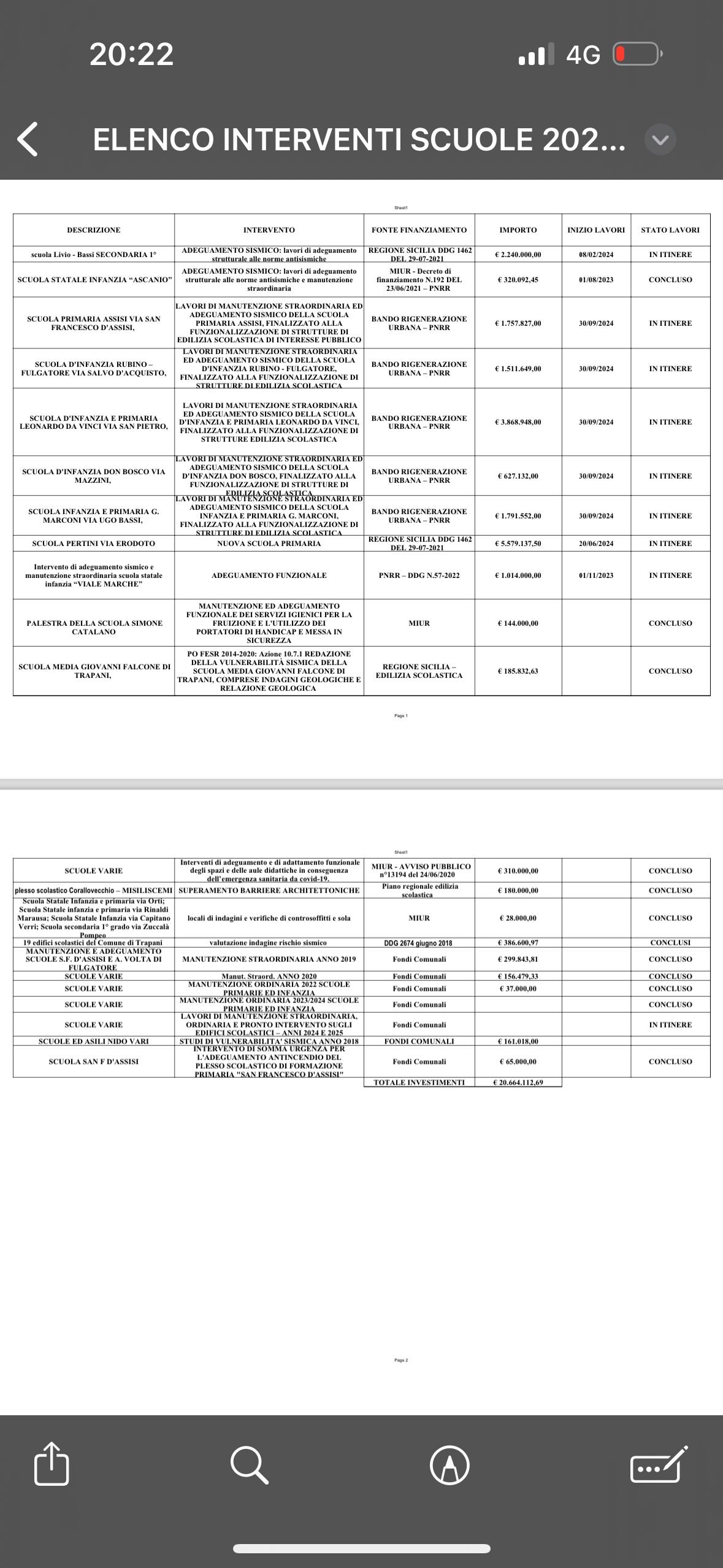 E il sindaco di Trapani Giacomo Tranchida aggiunge e conclude: “Dove erano questi novelli alfieri di Fratelli d’Italia quando le passate amministrazioni – che sotto vesti politiche diverse costoro direttamente sostenevano – hanno lasciato le scuole in stato pietoso e senza adeguamenti alle normative di sicurezza e sanitarie? Non hanno mai detto né fatto nulla a tal proposito!Oggi noi ci stiamo facendo carico delle loro inadempienze ed incapacità politiche ed amministrative rendendo le scuole più belle e più sicure come abbiamo già fatto in quel di Erice”.