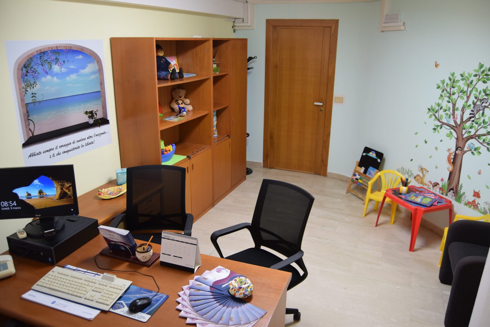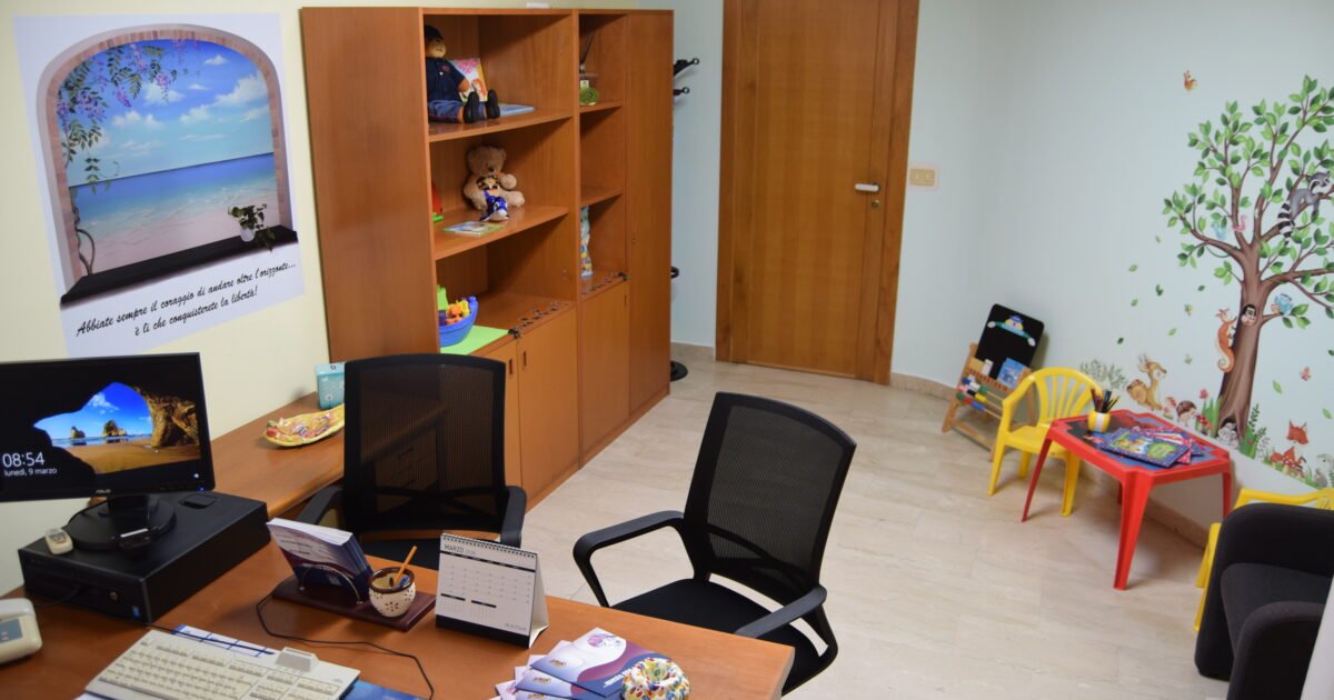 La sala è strutturata, tanto negli arredi quanto nei colori, al fine di agevolare un contesto favorevole al dialogo con l’obiettivo di stimolare tutte le vittime di violenze e abusi ad intraprendere un percorso di denuncia che possa costituire il giusto inizio per il superamento delle tragiche esperienze vissute e spesso relegate all’interno delle