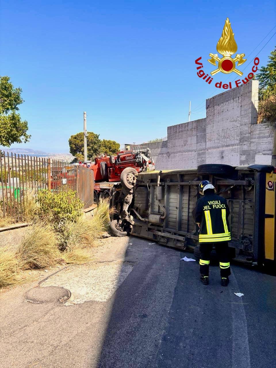 Mentre personale dei vigili del fuoco è impegnato per la rimessa in strada del mezzo tramite Autogrù VF.