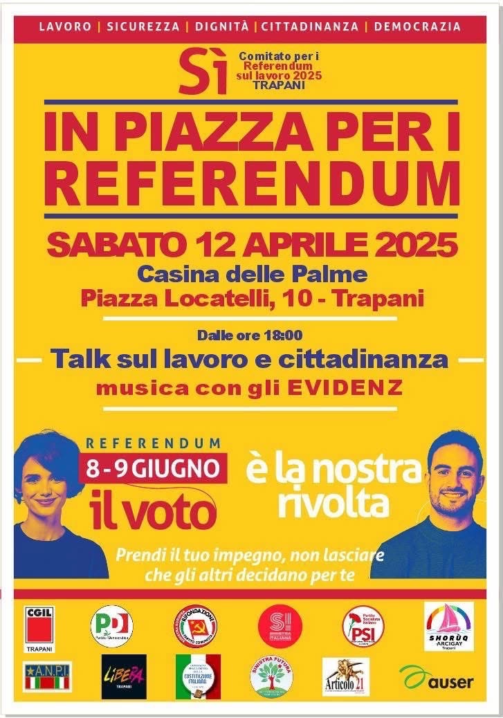 Trapani – Oggi pomeriggio, prende ufficialmente il via la campagna per il Referendum dell’8 e 9 giugno 2025. Dalla suggestiva cornice della Casina delle Palme, si alza la voce di cittadini, associazioni e partiti per dire “Sì” al cambiamento. L’appuntamento si concentra in piazza Lucarelli a partire dalle ore 18, con una serata all’insegna del confronto sul lavoro, i diritti e la partecipazione democratica.