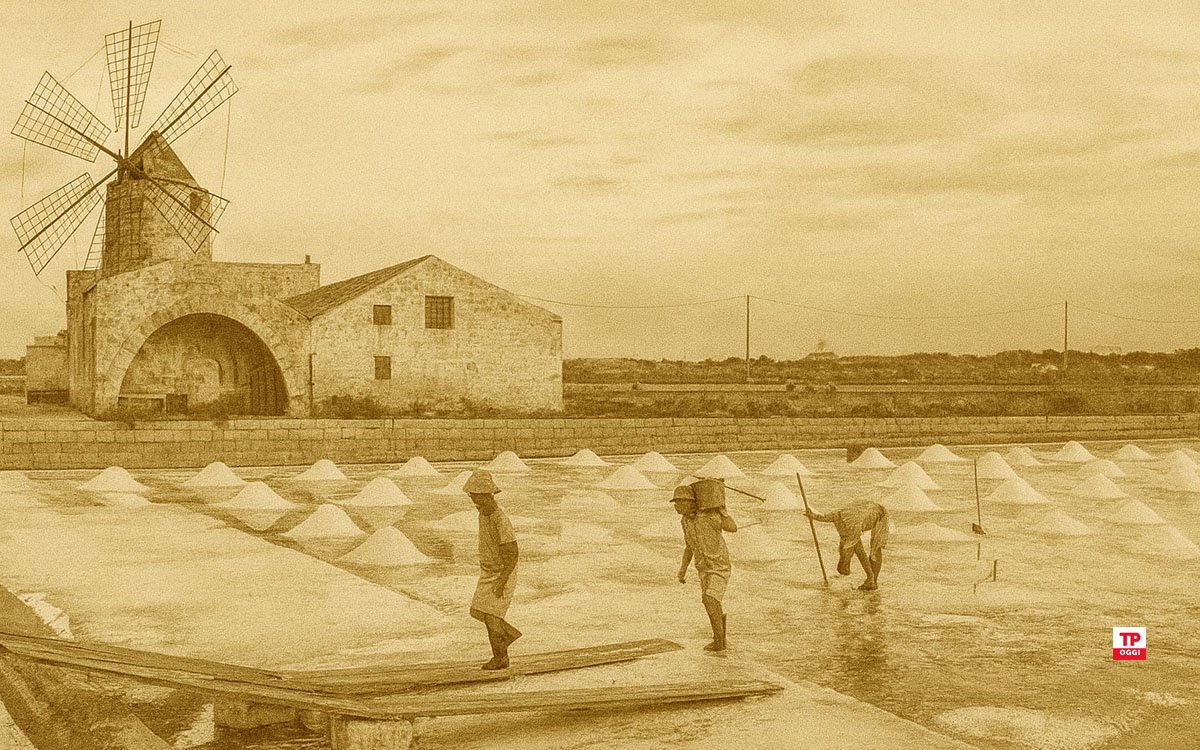Operai al lavoro nelle saline di Trapani durante la raccolta del sale, con lo storico mulino a vento sullo sfondo.