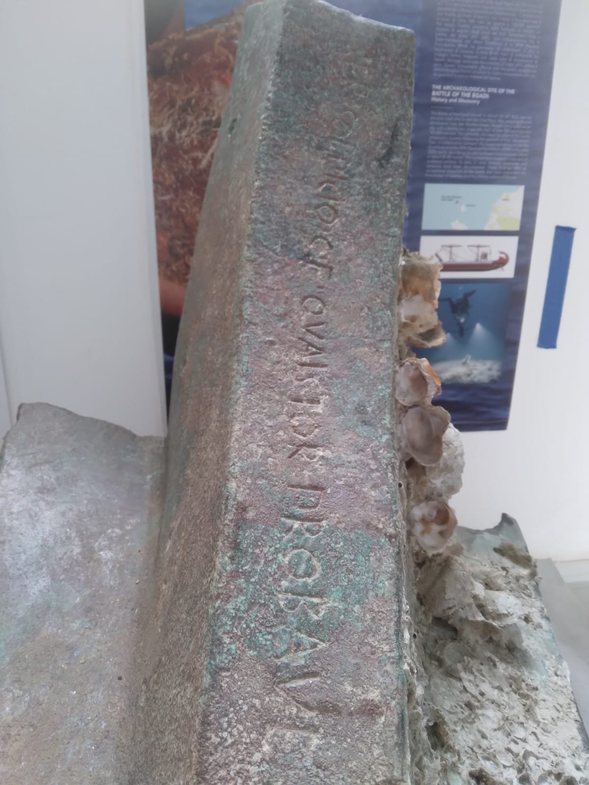 Inoltre, è stato pulito il rostro numero 25 già recuperato in una precedente campagna: è romano e presenta l’iscrizione “Ser.Solpicio C.F. Quaestor Probavi(t)”, probabilmente: “Servio Sulpicio, questore, figlio di Gaio, approvò”, sottinteso il rostro. Il Gaio, di cui il questore nominato era figlio, potrebbe ipoteticamente essere Gaio Sulpicio, console dal 243 a.C. e dunque in piena prima guerra punica.