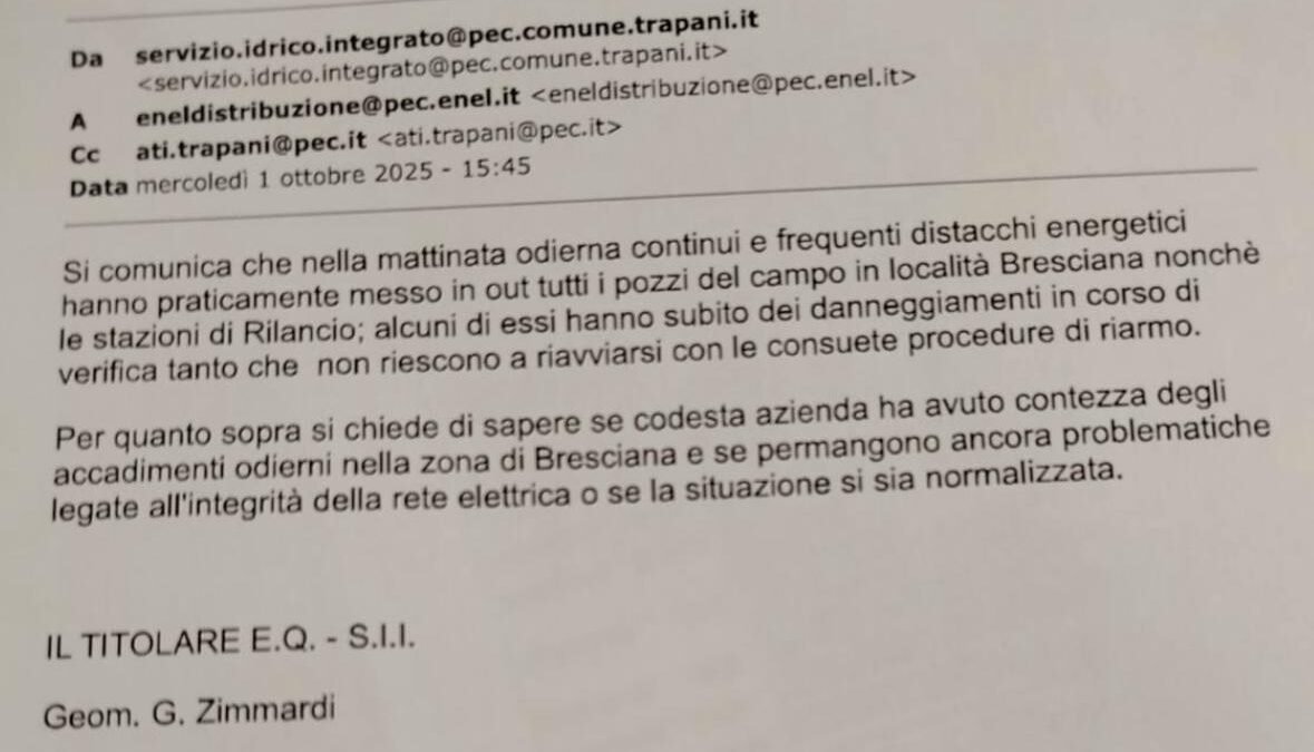 Trapani – Saranno addebitati all’Enel i danni dopo l’ennesimo fermo ai pozzi di Bresciana. La situazione dovrebbe normalizzarsi entro domenica. Il titolare di E.Q. Servizio Idrico Integrato del comune di Trapani, il geometra Zimmardi ha già scritto all’Enel.