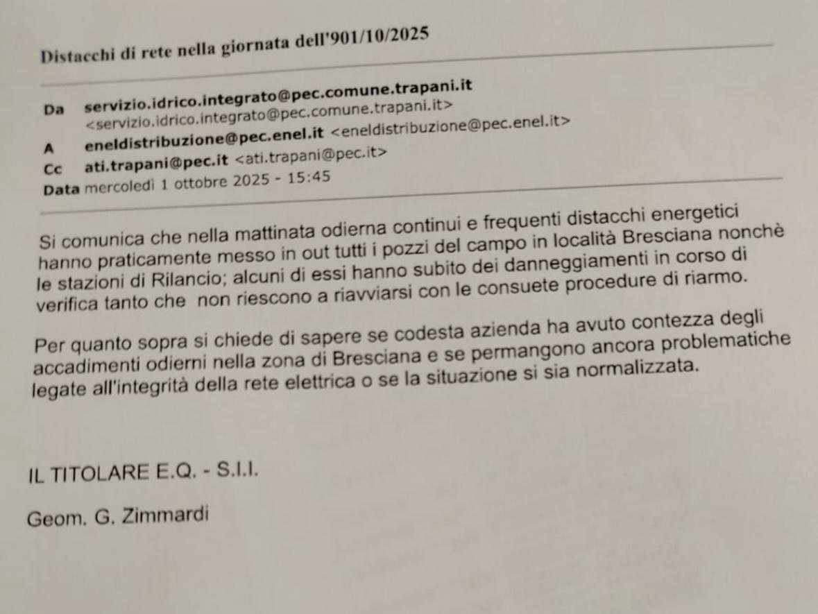 E-Distribuzione ha provveduto a informare S.E. il Prefetto di Trapani, trasmettendo una copia della relazione tecnica-fotografica. L’Azienda conferma la propria piena disponibilità al dialogo e alla collaborazione con le istituzioni locali, nel rispetto dei ruoli e delle competenze, per contribuire attivamente alla risoluzione delle criticità e al miglioramento del servizio, auspicando che possa presto tenersi un incontro tra tutte le parti coinvolte, finalizzato a individuare soluzioni condivise e definitive per superare i disservizi e ridurre i disagi alla cittadinanza.