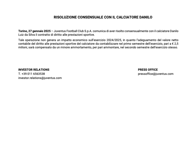La Juventus, attraverso un comunicato ufficiale, ha chiarito i dettagli economici della rescissione consensuale, confermando che l’operazione non avrà alcun impatto economico negativo per il club. Tuttavia, al di là degli aspetti finanziari, è evidente che la partenza di Danilo rappresenta una perdita significativa dal punto di vista tecnico e umano.