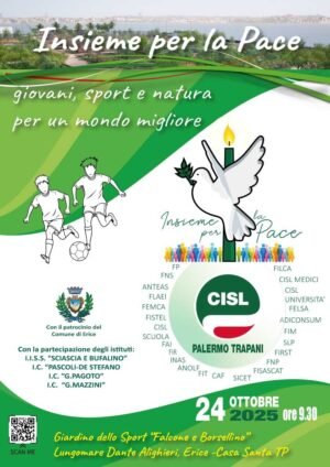La giornata avrà tre momenti, un primo che coinvolgerà i piccoli delle primarie in un “girotondo della Pace” e nella realizzazione di disegni sullo stesso tema; un secondo momento vedrà protagonisti gli studenti della scuola secondaria di primo grado che si “sfideranno” in un mini torneo di calcio della durata di circa 30 minuti per ogni partita; e un terzo momento con la posa di una targa sulla pace della Cisl Palermo Trapani e la piantumazione di un albero simbolo della giornata. Tutti indosseranno le magliette realizzate dalla Cisl Palermo Trapani con il messaggio “Insieme per la Pace”. I tre momenti saranno intervallati dagli interventi delle istituzioni che saranno presenti all’evento che sarà aperto dalla segretaria generale Cisl Palermo Trapani Federica Badami, dal saluto del sindaco di Erice Daniela Toscano e concluso dal segretario generale Cisl Sicilia Leonardo La Piana.