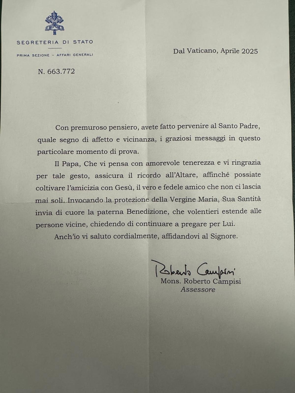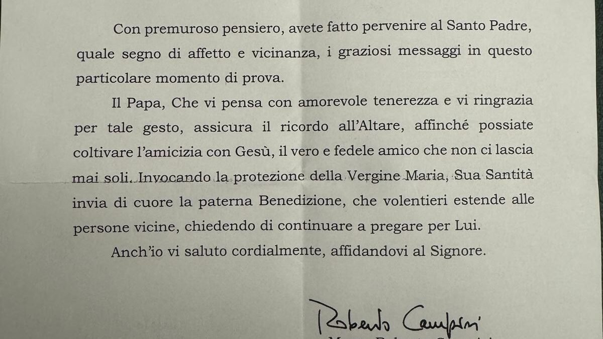 Dopo averli raccolti li ho inviati insieme a una lettera che esprima la vicinanza di tutta la comunità parrocchiale. Oggi è arrivata dalla Santa Sede la risposta che è partita da Roma proprio il 21 aprile, giorno della morte di Papa Francesco. L’ho aperta con commozione ho aperto leggendola insieme ai parrocchiani che erano presenti. La conserveremo gelosamente – dice – Sono certo che i nostri bambini non dimenticheranno questo momento”.